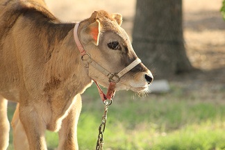 Jersey calf eagerly waits for her evening milk...